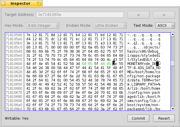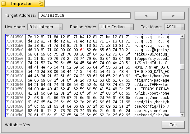 Shown above is a block of memory in the target team that contains, among other things, the arguments and environment variables passed to the program when starting. The inspector window now has an indicator to show whether the current block is editable or not (some regions of memory are not, since, for instance, executable images are mapped into memory with read-only permissions). If the block is editable, as is the case for the one above, one can now click the accompanying Edit button to switch the inspector over into an editor mode. This currently takes the form of a hex editor similar to the one that can be found in applications such as Diskprobe. Any changes made will also be highlighted: