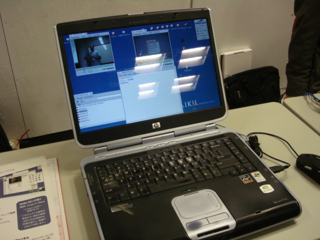 Demo machine at KOF Haiku boothNot surprisingly, it took me much longer than originally planned to find the time to write about the second day at the Kansai Open Source Forum conference (KOF). But no worries: memories are still quite fresh, as it's usually the case when things go well and you have fun. The second KOF day started earlier, especially for me. The exhibits were scheduled to open at 10:00AM, so with Momoziro we decided to meet at the hotel lobby at around 9:00AM. But I was up way before that, at around 5:30AM (compliments of my very jet-lagged old body). So I sat in front of my laptop to write some emails and then went through my Haiku presentation slides again, making little changes here and there, changing the order of a few slides and even adding a couple of slides based on some of the questions that I had received during the first day at KOF.