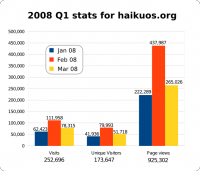 I admit it: I have a weakness for website statistics. So late last year, I added Google Analytics (GA) to the Haiku website. GA gives you a wide array of information such as number of visits, page views, bounce rates, as well as geographic data and information related to the used operating systems. I wanted to get see this information myself, but I also wanted to share it with the community (don't worry, it's all anonymous data), so that everyone can get a peek at another and different metrics of how our project keeps growing over time. So here is a brief activity overview for the Haiku websites for the January thru March of 2008 period.