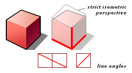 Haiku icons inherit the perspective of the BeOS icons and add some of their own. If a cube were sitting on the floor, the angles of its edges would be defined as follows: the line where the left front side and the floor meet would have an angle such that for every two pixels it goes to the right, it goes one pixel down, and the line of the right side meeting the floor goes one pixel up for every pixel going right. Vertical lines are straight without any angle to help make the icons crisper (realistically, icons should be wider at the top but they aren't).