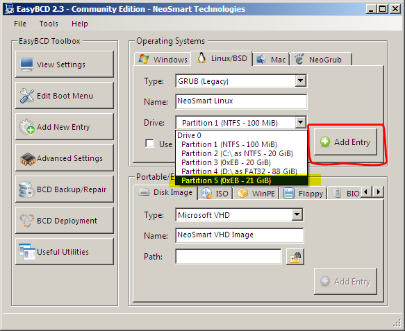 - In the “Drive” section choose your haiku partition which will have the “0xEB” ID in its string, if you have multiple haiku partitions, you would have to figure out which one by its size.
