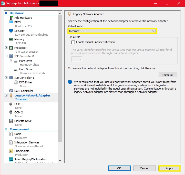 Haiku does not currently work with the default type of network adapter on Hyper-V, so the adapter must be changed. Click on the “Add Hardware” section, add a “Legacy Network Adapter” and click “Apply” (see picture 4-4).