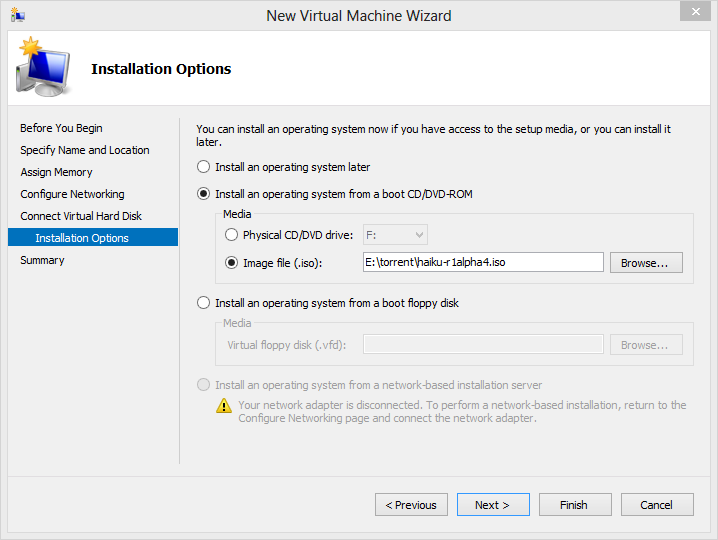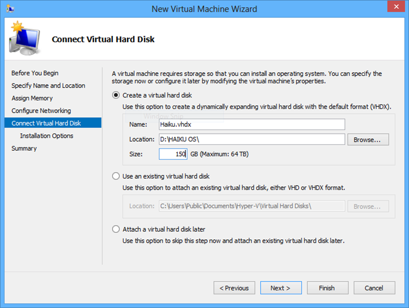 On the following screen you are asked to create a virtual hard disk or attach to an existing virtual hard disk. We will create a virtual hard disk, so give it the name “Haiku.vhdx”. The virtual hard disk size can run with 1GB hard drive but it will need something over 5GB in order do the things you want. You are also asked give location of where the virtual hard disk will be kept; give it lots of room (see picture 2-2)! When you are finished click “Next” again to go the following screen, here you are asked to specify where your installation media is.