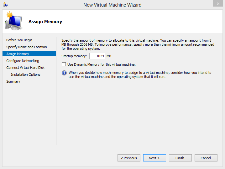 Click “Next” to go to the Assign Memory window. You need to tell Hyper-V how much memory it can use with this virtual machine, as otherwise the Virtual Machine might consume all the memory of your actual machine. A general rule is to use half of your total RAM e.g. if you have 8GB of RAM, give the Virtual Machine 4GB. You can also check the “Use Dynamic Memory” checkbox, which will allow Hyper-V to use more memory when it needs to (see picture 2-1).