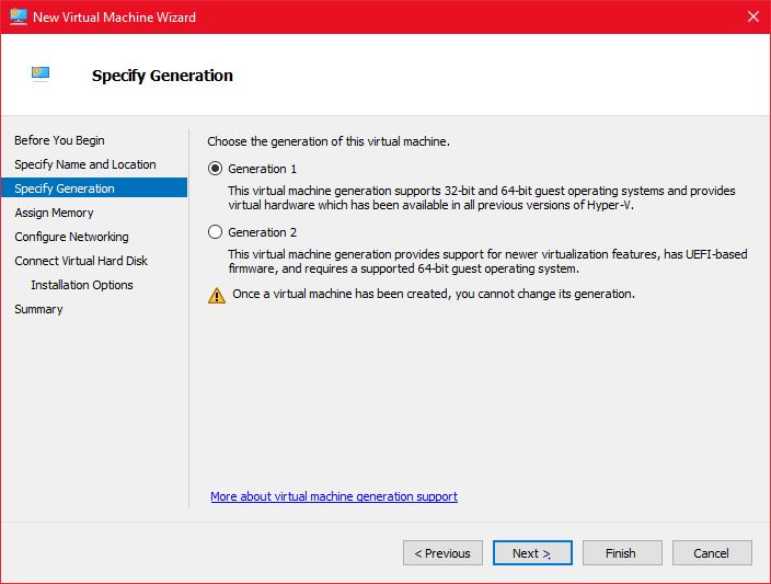 If you are running Windows 10 or Windows Server 2016, there is an additional step that you must perform (shown in picture 2-1-1). When you click the “Next” button, you are prompted to select the machine’s generation. Always select “Generation 1” for Haiku.