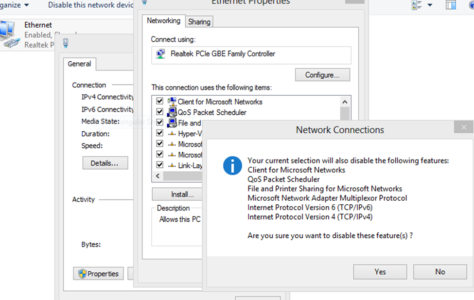 Windows will give you a warning about items being disabled (such as IPv4, etc.). Click “Yes” to the dialog that appears (see picture 4-2). At this point you will see the “vEthernet” connection switch to the “Identifying…” state, so just wait a few moments until you are connected to your local network again.