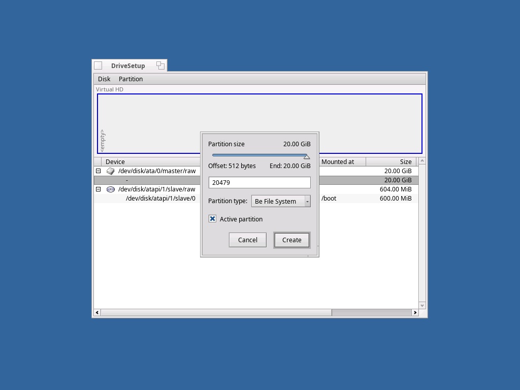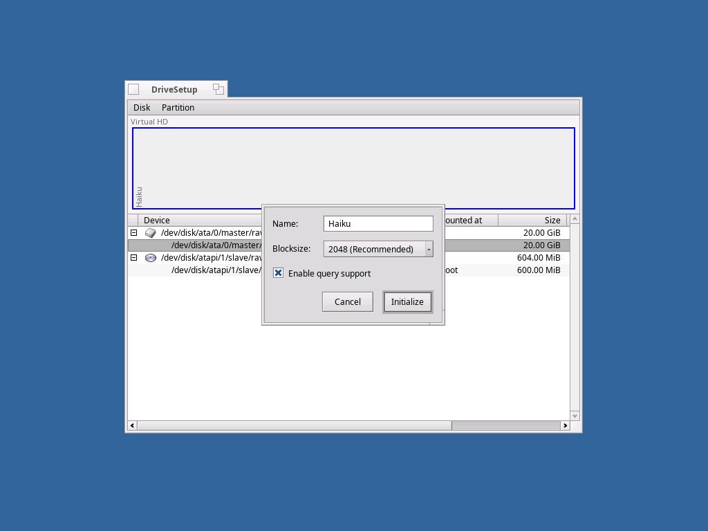 There is one final step before the file system is ready: formatting our partition. To do this, right-click on the partition that we just created, now called “(Be File System)”. Then, hover over the “Format” option and click the “Be File System…” item. Once again, click “Continue”. You should now see a box asking for a name to give the partition (seen in picture 3-6). Call it “Haiku” (the default) and click “Initialize” and “Write changes”. Once this is done, click “Ok” and you now have a working file system.