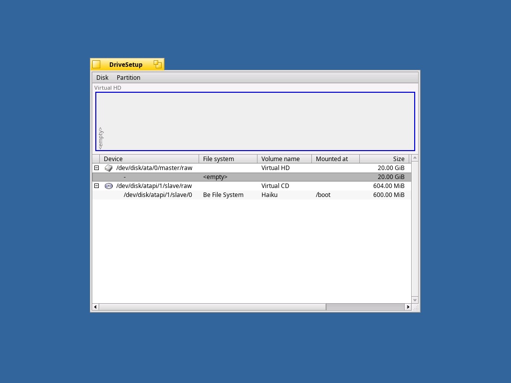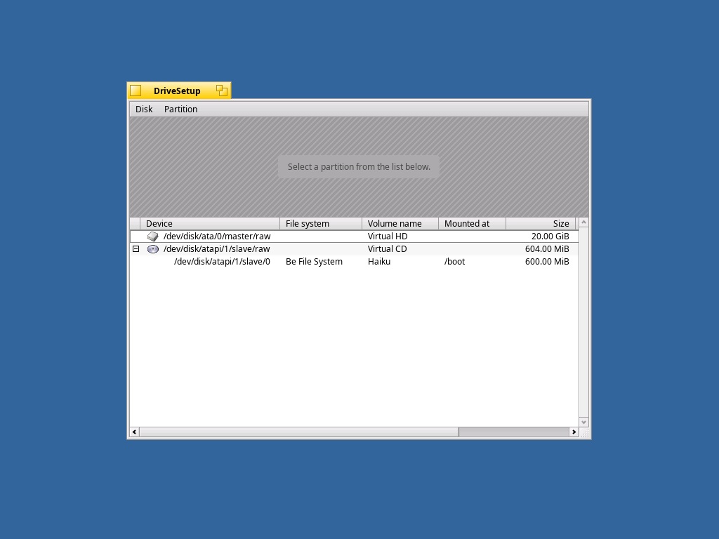 Now that we have created the virtual machine, we need to start the virtual machine and install Haiku. On the main screen, double click the virtual machine we just created, which should be located in the column Virtual Machines. Now on the window that pops up click Action > Start. This will start the virtual machine and the installation will begin. You should see a screen like picture 3-1.
