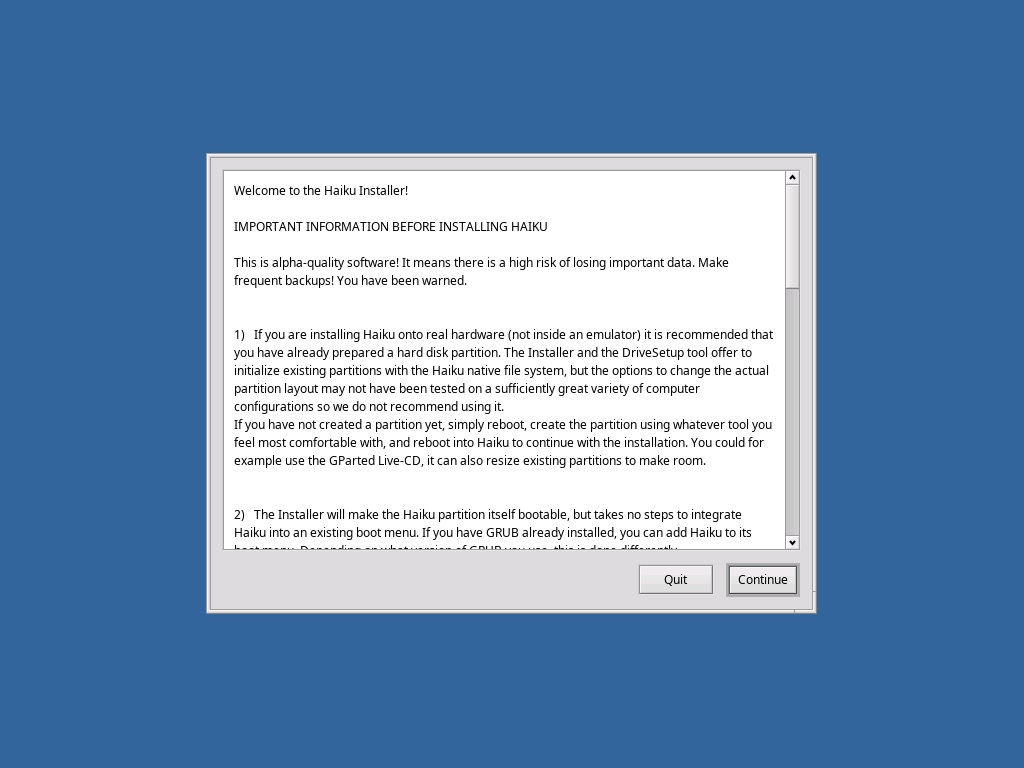 After clicking the “Run Installer” button, you should see a screen like the one shown in picture 3-2. This is just a message warning you that Haiku is alpha-quality software, which may crash and break at times. After reading the text on the new screen (or not reading it), click the “Continue” button to carry on with the installation.