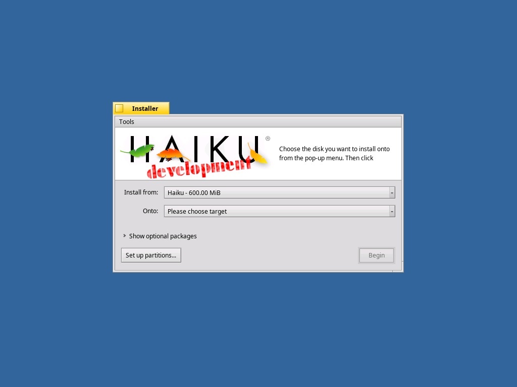 Close the “DriveSetup” program by clicking on the box in its top-left corner to return to the main setup menu (as seen in picture 3-3). This time, click the “Onto” drop-down and select the partition we just made (the one called “Haiku” that is not greyed out). Once that is done, just click “Begin”. The setup will then install Haiku onto the partition you just made.