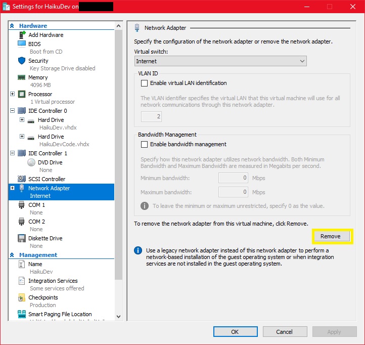 Now, open the settings window of your Haiku Virtual Machine by right-clicking on its name and selecting the “Settings…” option. Then, click on the “Network Adapter” icon and click the “Remove” button (see picture 4-3). Press “Apply” to save your changes.