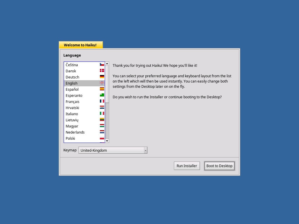 As you can see in picture 3-1, the first screen that you should encounter when booting the ISO is the language-select screen. You should select your language from the list to the left, we will assume English to be your default for this guide. After that, select your keyboard mapping from the “Keymap” dropdown. This is important because your keyboard may be typing the wrong keys if Haiku does not know what format it uses.