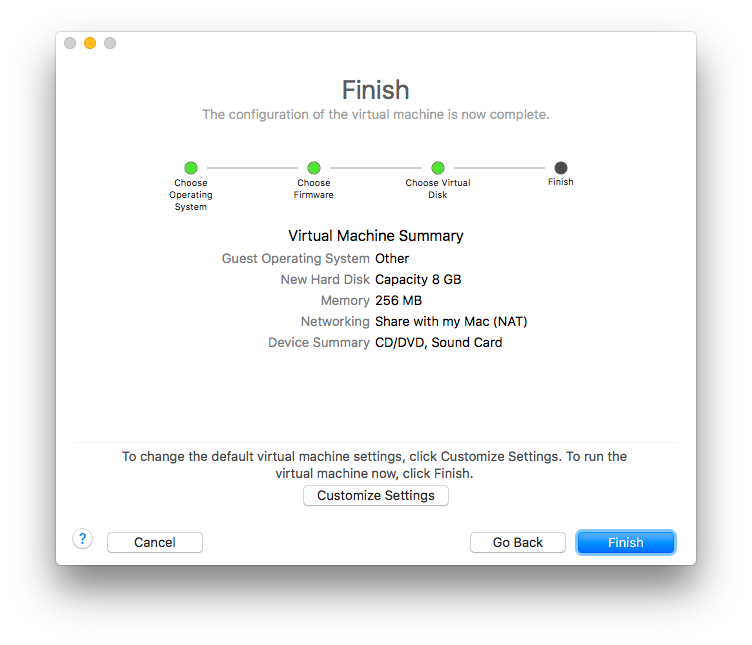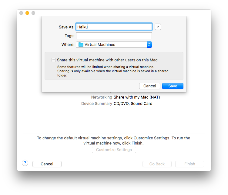 Verify the settings of the virtual machine. We now need to attach the Haiku ISO to the virtual machine. Click Customize Settings.