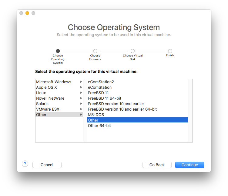 On the operating system type screen, select Other. For version, do take note to make sure that Other is selected. Do not select Other 64-bit. After selecting, click Continue.