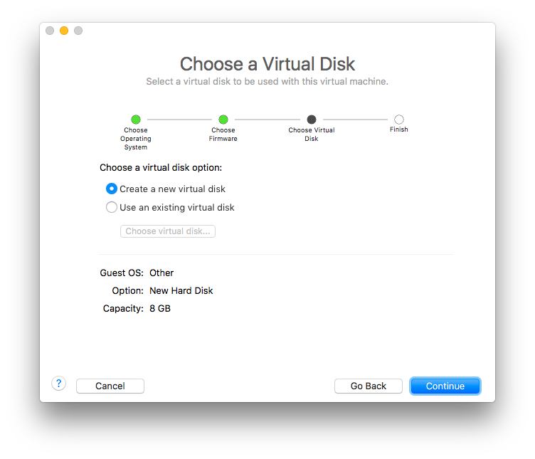 Then, you can choose to use an existing virtual disk or create a new one. The default values should be enough to install Haiku. Click Continue.