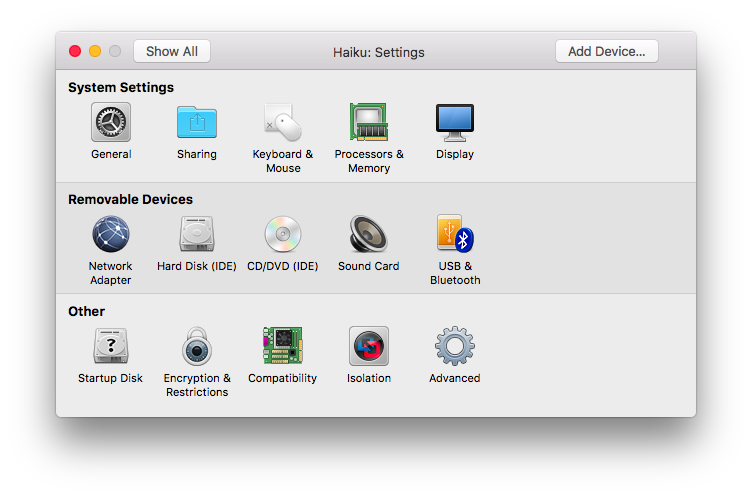 To adjust the amount of memory the virtual machine uses, we go back to the main settings window by clicking Show All. Then, click on the Processor & Memory panel.