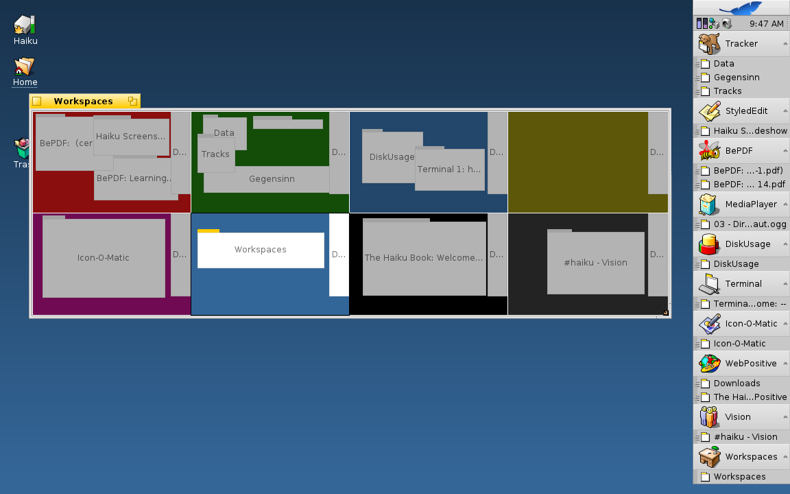 Spread out your work over up to 32 virtual workspaces, each may have a different background color or image and even screen resolution.